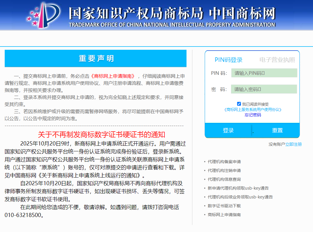 关于不再制发商标数字证书硬证书的通知 2025年10月20日9时,新商标网上申请系统正式开通运行。用户需通过国家知识产权公共服务平台统一身份认证系统完成身份验证后,登录新系统。用户通过国家知识产权公共服务平台统一身份认证系统关联原商标网上申···