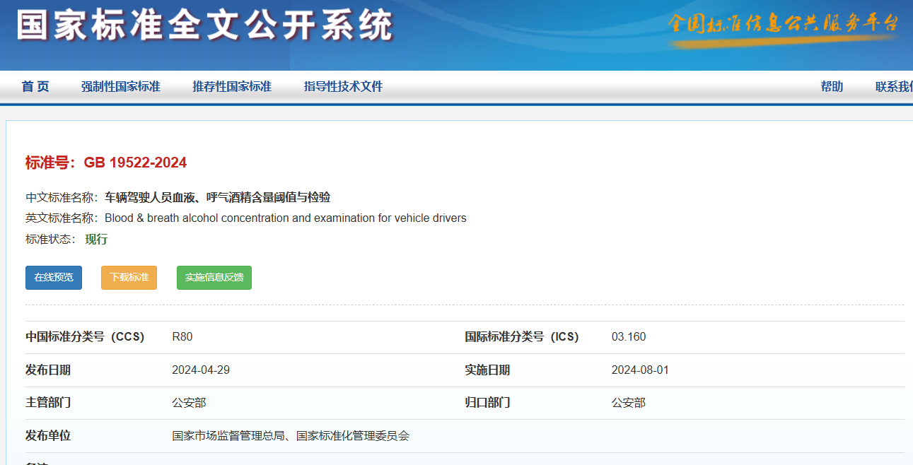 《车辆驾驶人员血液、呼气酒精含量阈值与检验》(GB 19522-2024)官网下载地址